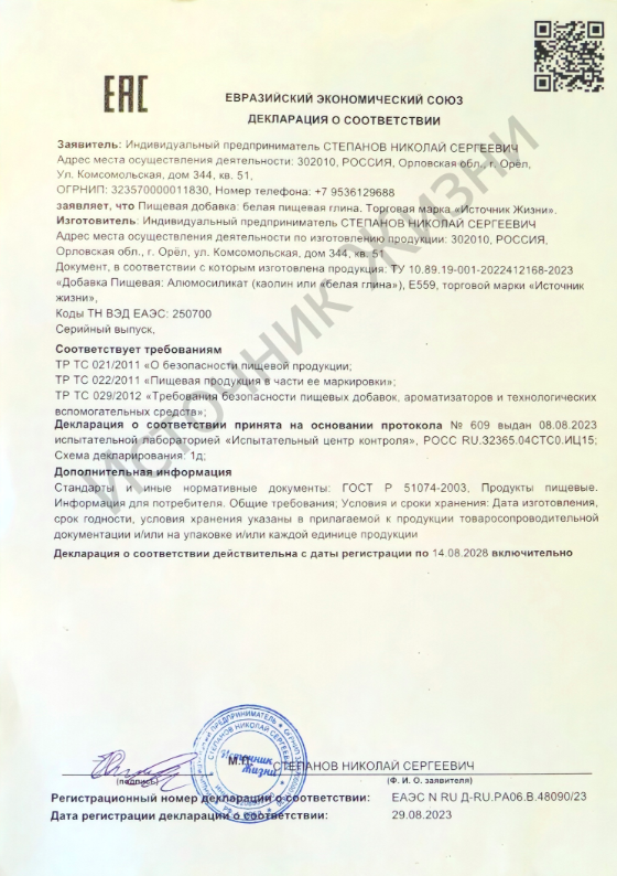 · Есть пищевой сертификат, декларация ЕАС